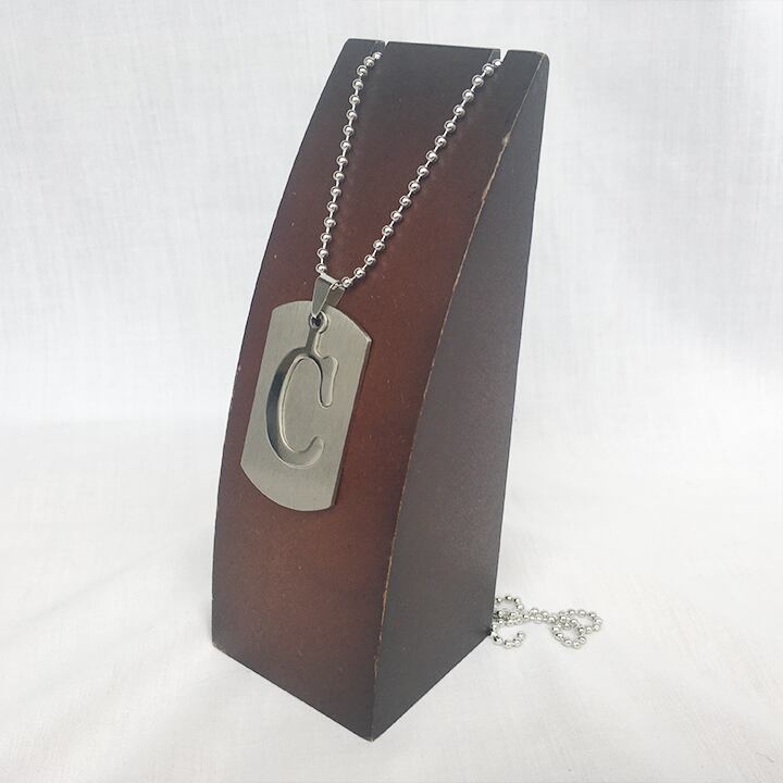 ドッグタグタイプのくり貫き型アルファベットネックレス。