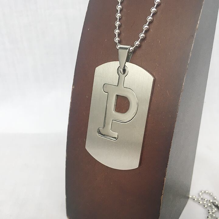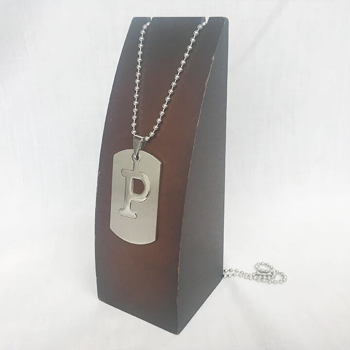 ドッグタグタイプのくり貫き型アルファベットネックレス。