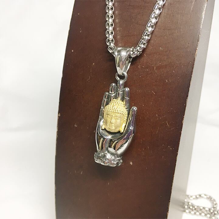 手のひらに仏陀のフェイスが優しく包まれたトップのネックレスです。