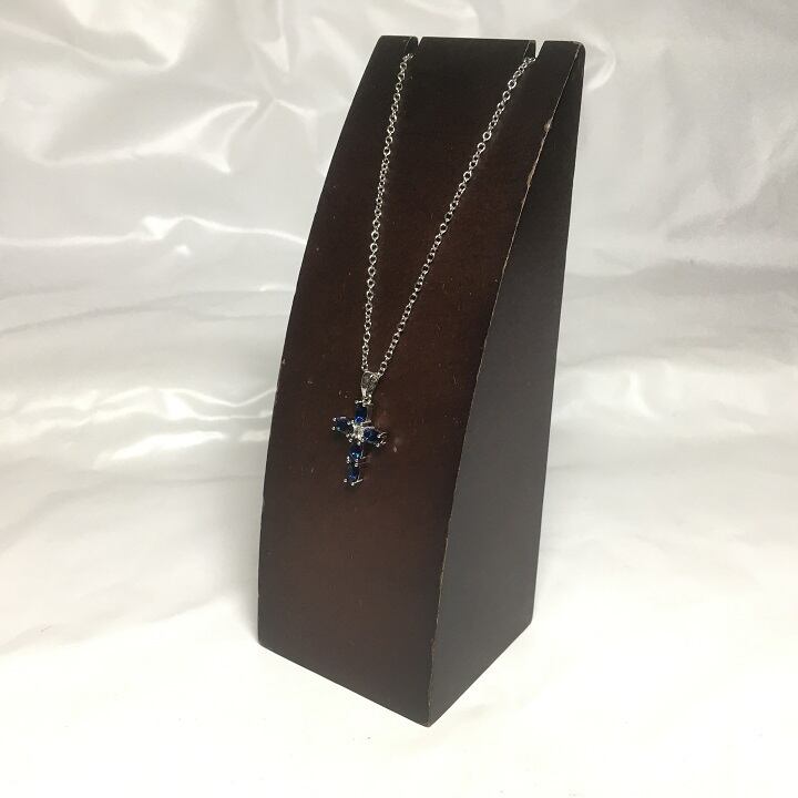 ブルー&クリアのジルコニアがクロス上に埋め込まれた小ぶりなクロスネックレス。