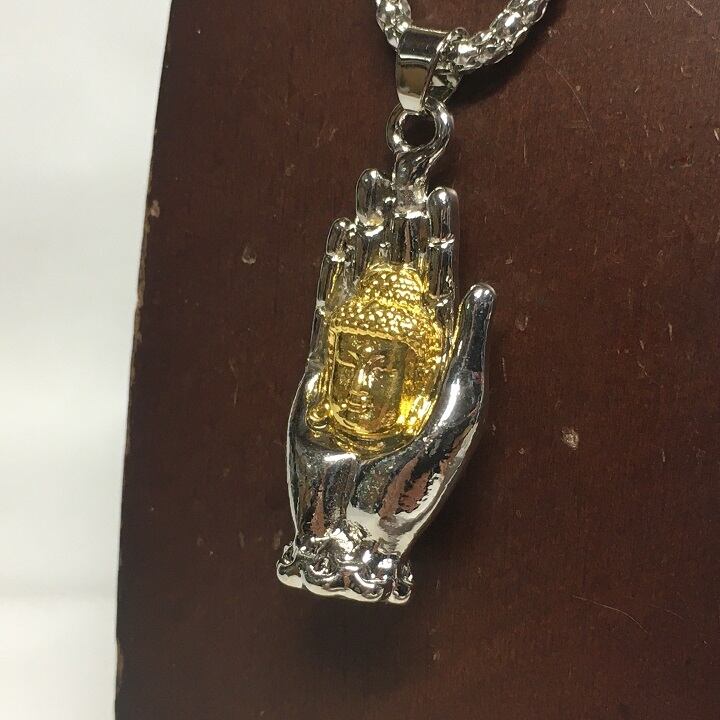 手のひらに仏陀のフェイスが優しく包まれたトップのネックレスです。